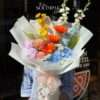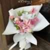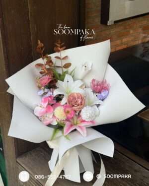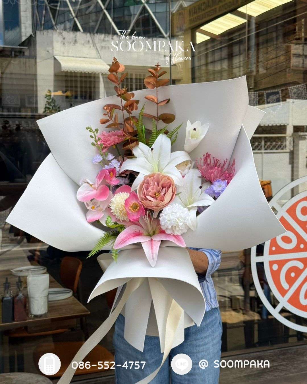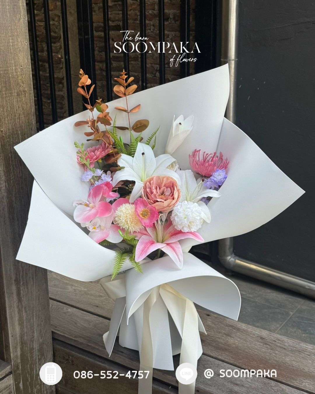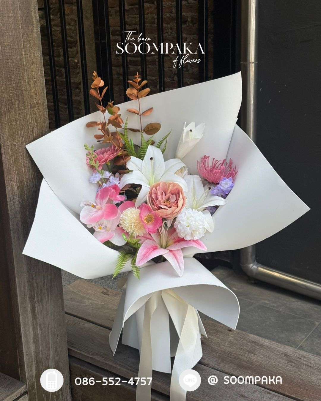 Artificial lily bouquet wrapped with white EVA foam sheet.