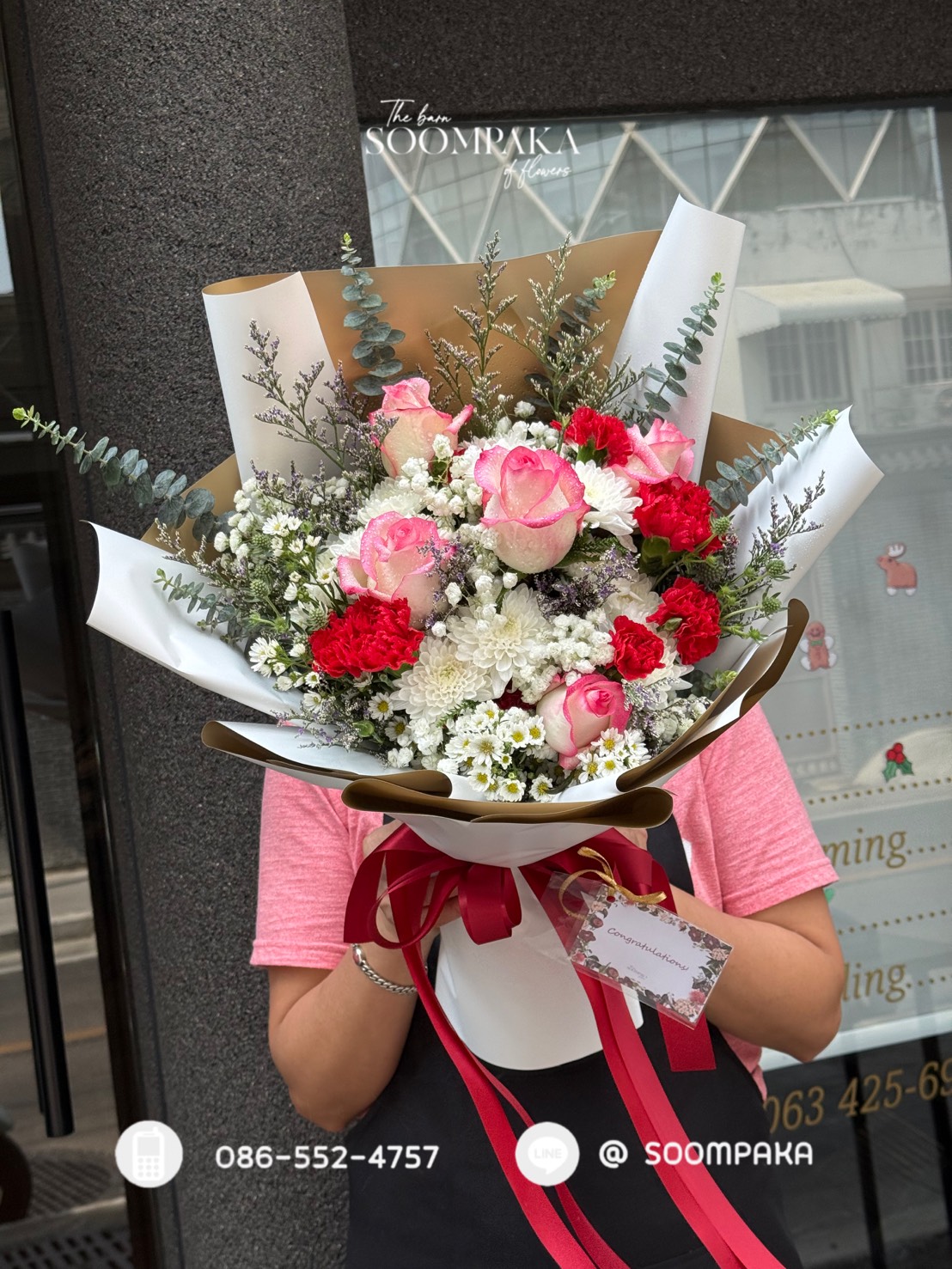 ช่อโทนชมพูแดง กุหลาบชมพู Titanic แซมคาเนชั่นสเปรย์สีแดง ให้ความรู้สึกสดชื่น กระดาษห่อสวยหรู มอบในโอกาสพิเศษ