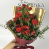 ช่อโทนแดงดำ กุหลาบแดงจัดเรียบง่าย แซมจิบโซขาว ห่อกระดาษดำสีเก๋แปลกตา