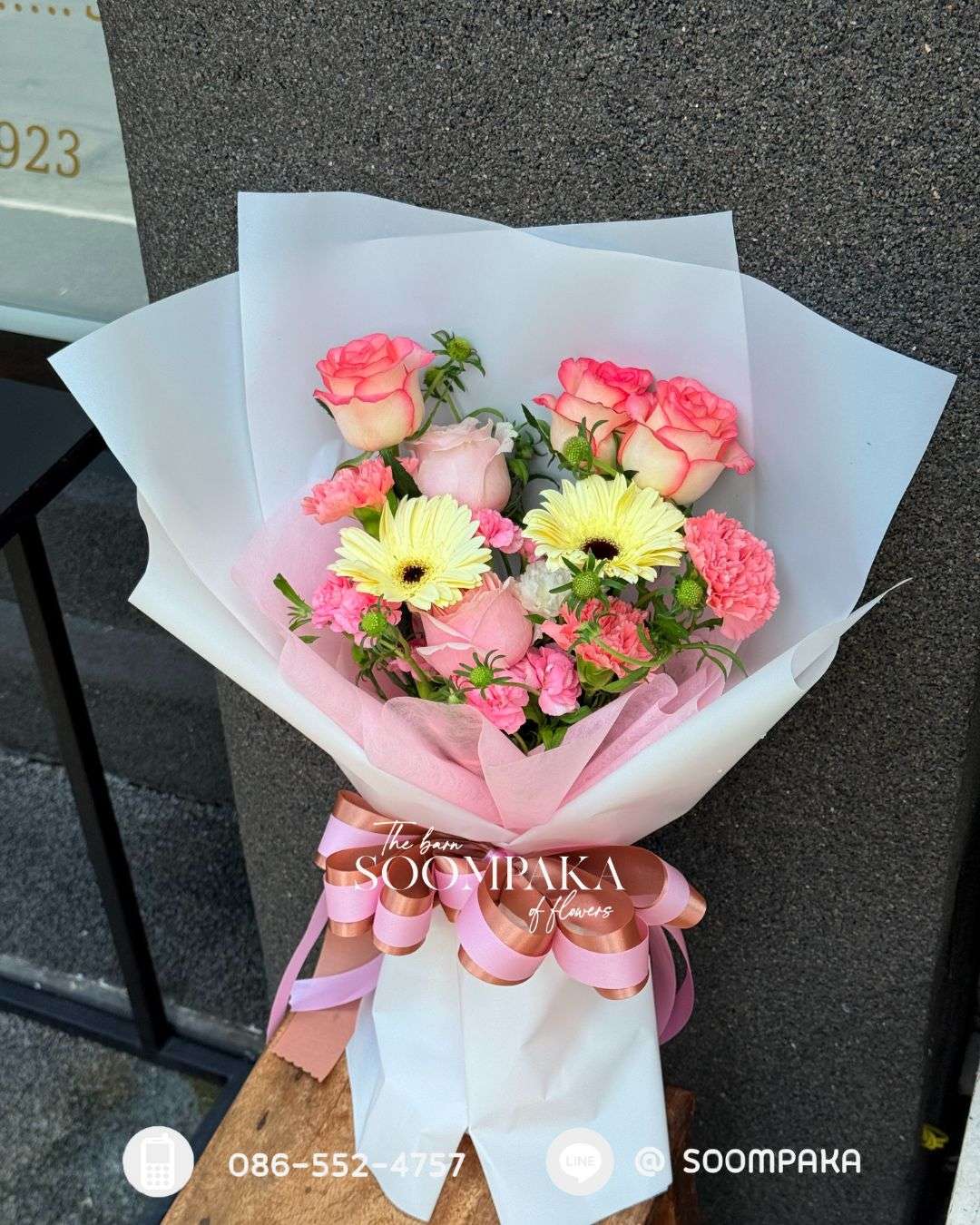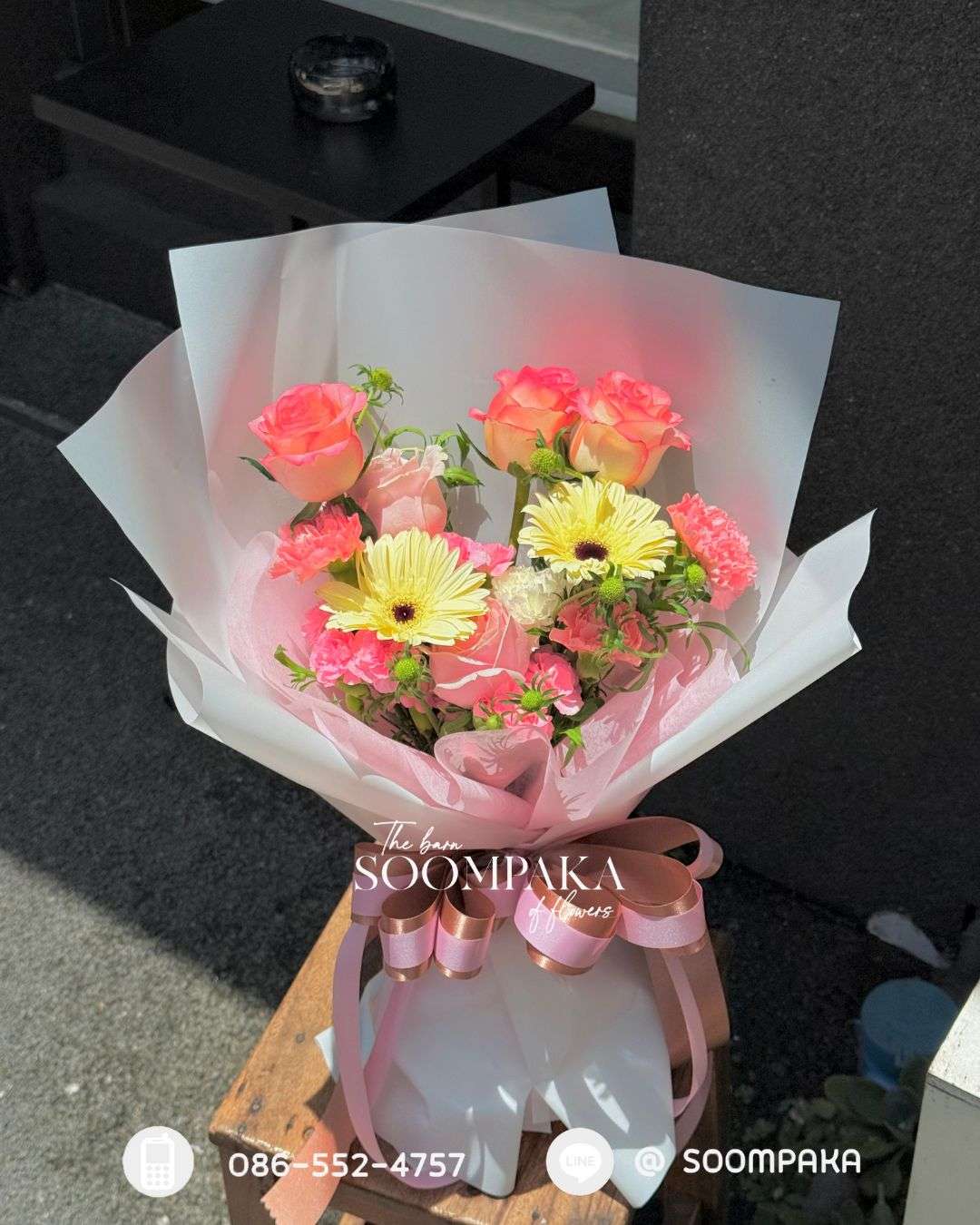 ช่อกุหลาบ เยอบีร่า คาร์เน่ชั่น โทนชมพูหวาน