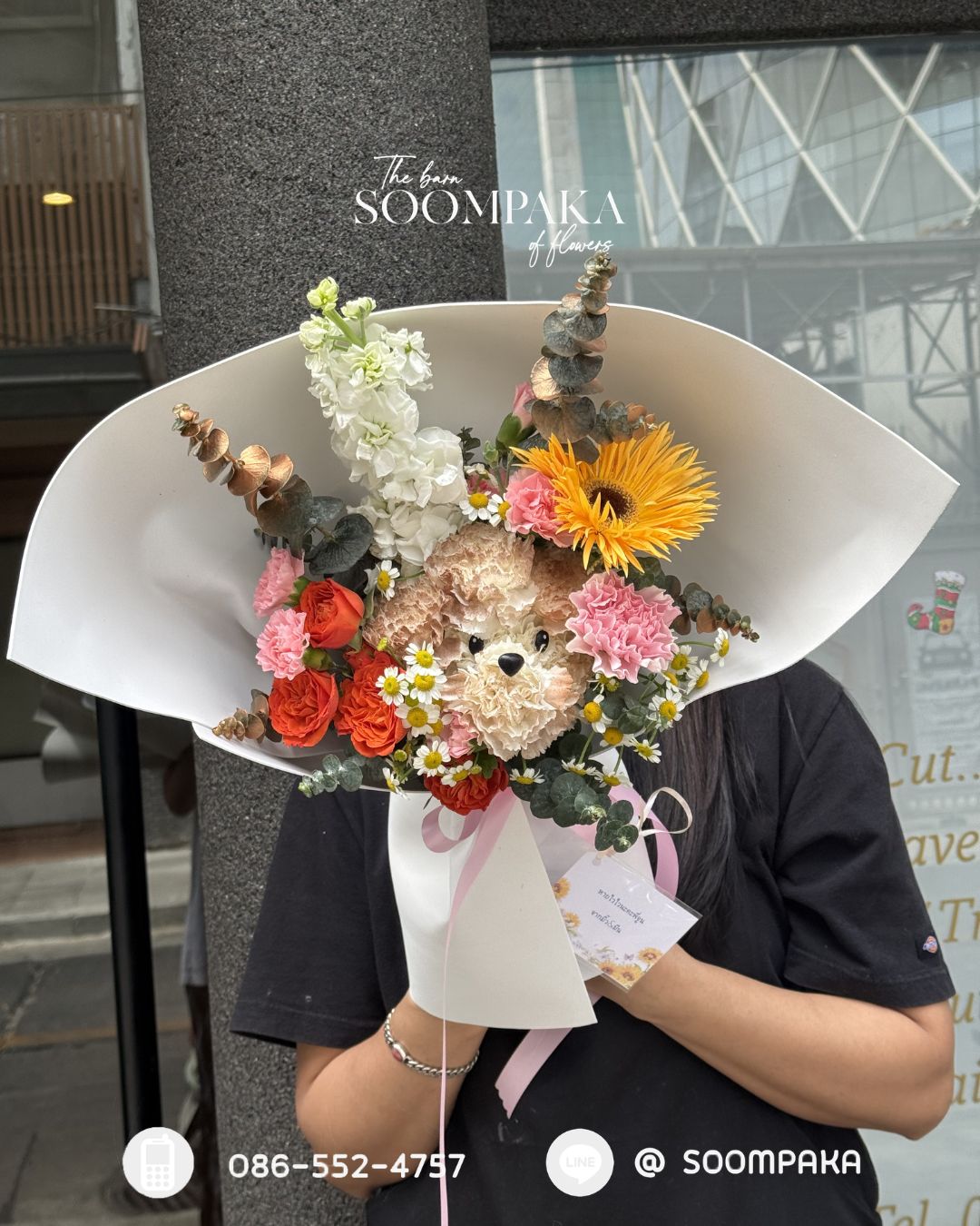 ช่อดอกคาร์เนชั่น 6 ดอก รูปหน้าน้องหมา จัดช่อพร้อมดอกแซม
