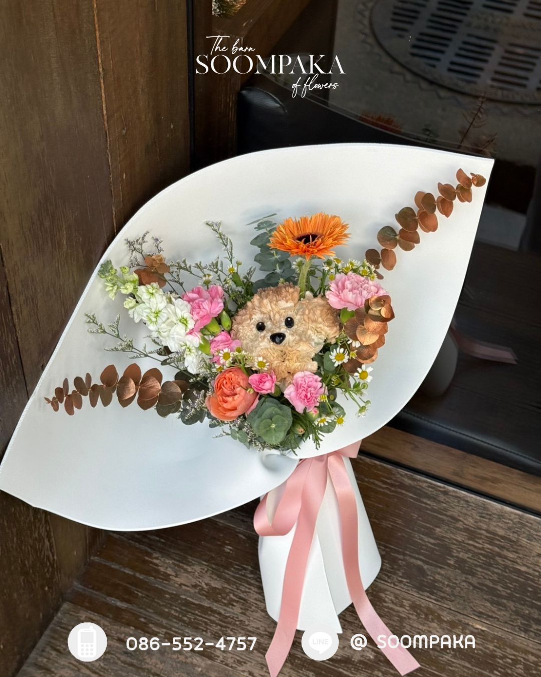 สามารถจัดตามโทนสีที่ลูกค้าต้องการ (สามารถเปลี่ยนสีโฟม น้องหมา และดอกแซมได้)