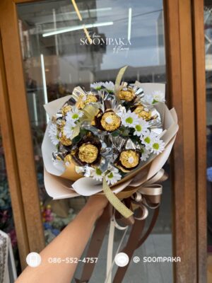 ช่อช็อกโกแลต Ferrero Rocher 9 ลูก แซมดอกไม้ประดิษฐ์ เพิ่มความหวานและความน่ารักให้กับช่อ