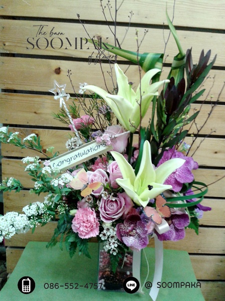 แจกันดอกไม้โทนม่วงชมพู จัดดอกไม้สไตล์เก๋หน้าเดียว ดอกไม้หลากชนิดรวมกันแลดูเป็นธรรมชาติเพิ่มลิลลี่ครีมสวยเด่นลงตัว โทนสีนี้ชมพูม่วงโทนสีหวานทรงสเน่ห์ ชวนหลงไหล มอบสำหรับมอบในโอกาสแสดงความยินดี อวยพรวันเกิด และโอกาสพิเศษอื่นๆ ขนาด 30*45 ซม.